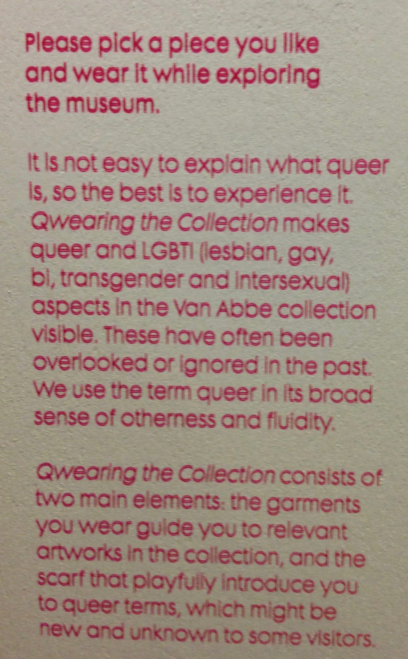 The program also queers the visitor experience by allowing folks to encode themselves in queer and flamboyant ways. Although I don’t normally “read” as LGBTQ to strangers, at the Van Abbemuseum I was able to swish around the collection in a “Qwearing the Collection” kimono and bright yellow scarf. Those who did not know about the program just thought I was odd; those who did know about the program understood that, by wearing these accessories, I was signaling my interest in a queer point of view. This led to numerous conversations with strangers and a special-club nod across a gallery from another visitor wearing this program’s accoutrements. In this way, the “Qwearing the Collection” props mimicked the experience of being part of a semi-secret subculture, where members adjust their appearance in ways that may not be understood by mainstream society, but serves as a signal for others who identity with the same subculture that you are friend, not foe. Brilliant!