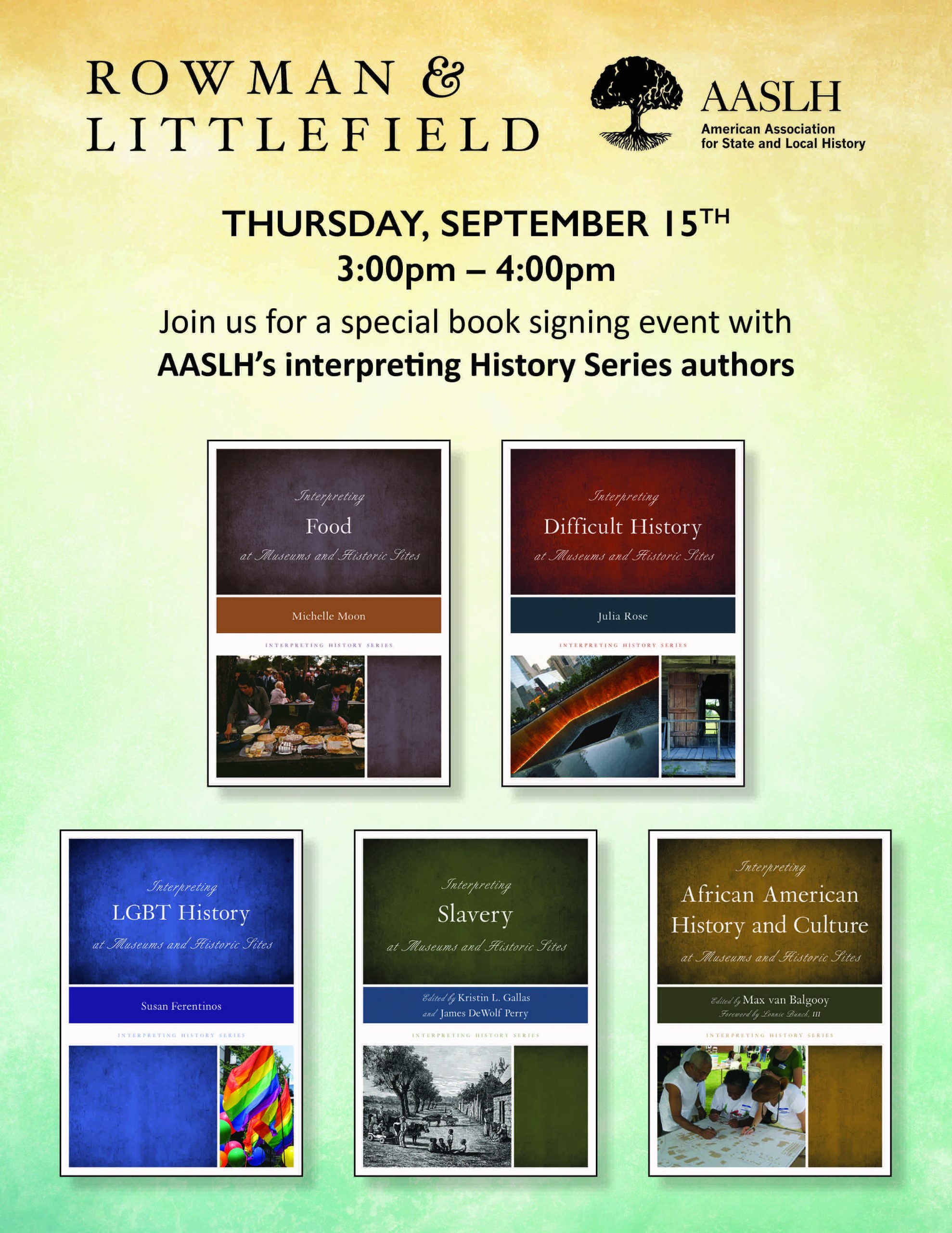 On Thursday, September 15, 2016, at 3:00 pm local time, Rowman & Littlefield Publishers will be hosting a reception for the authors of their “Interpreting History” series, which includes my book Interpreting LGBT History at Museums and Historic Sites. Stop by the conference exhibit hall to learn more about the series and to chat with the authors, including myself.